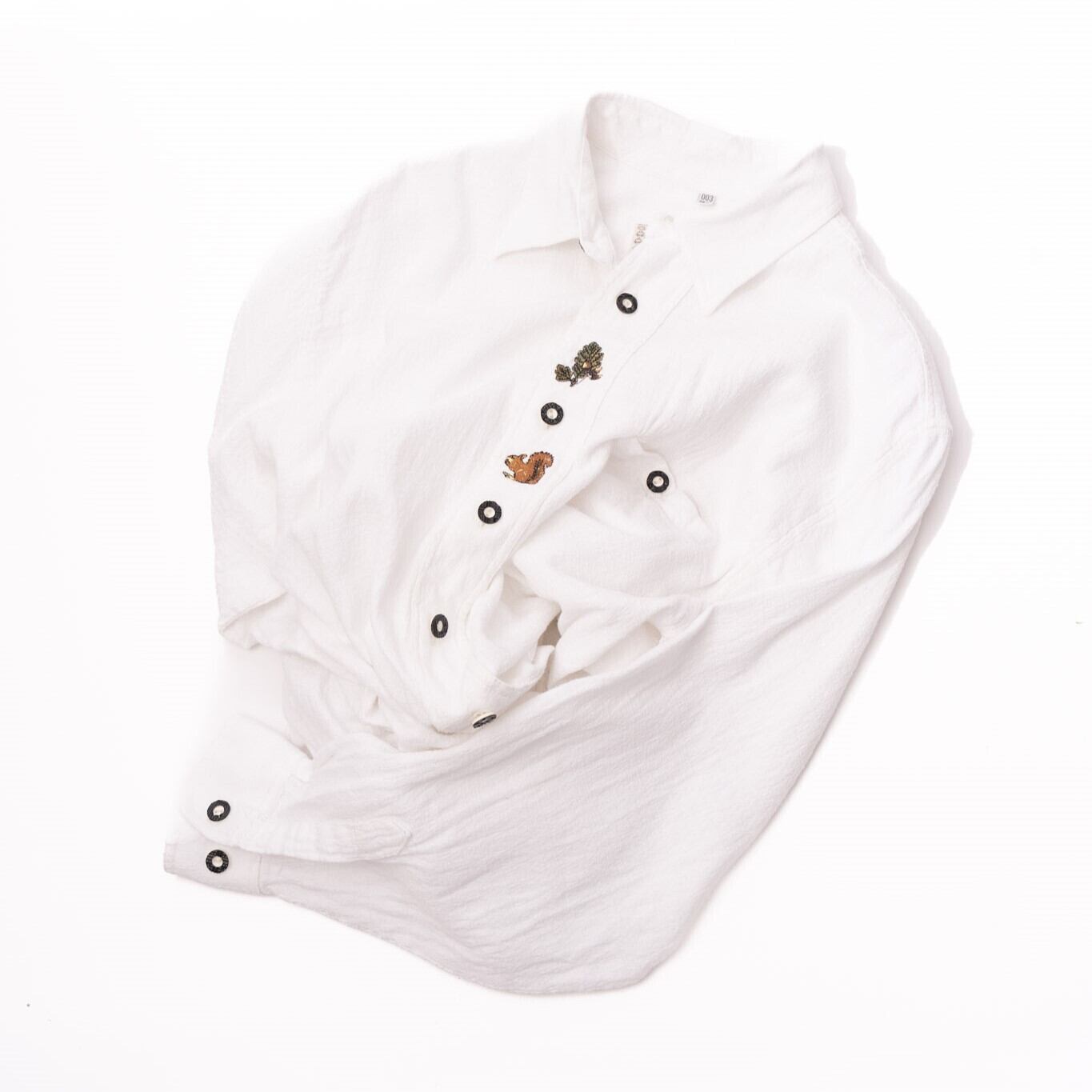 そんな中でも今回はリスとどんぐりの木が刺繍された一着です。小ぶりかつ深みのあるカラーの刺繍で白地とよく馴染み、ただの白シャツとはまた異なる上品な雰囲気を醸し出しています。