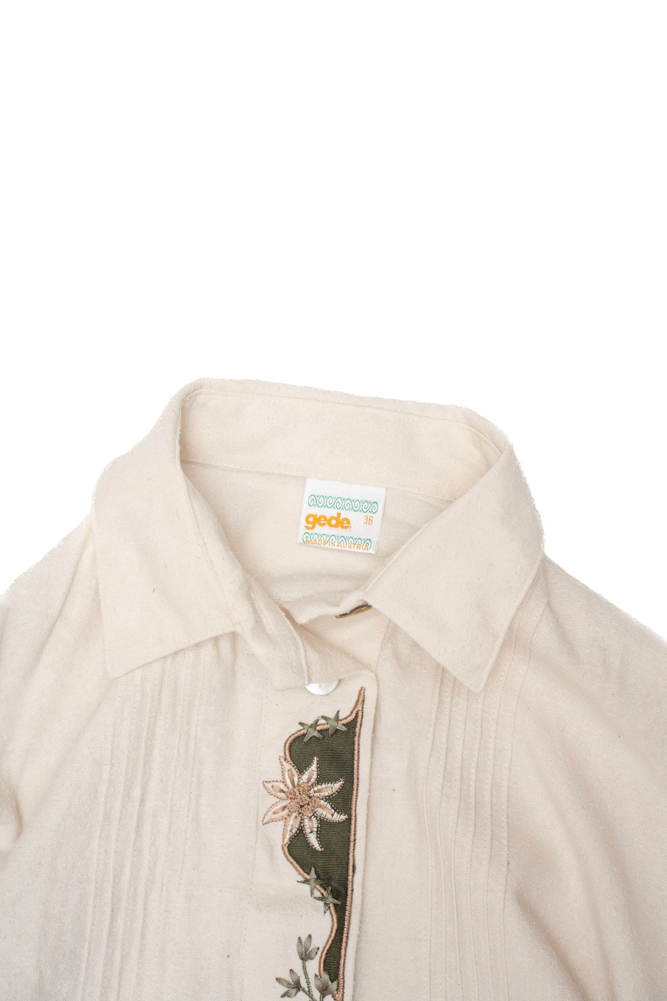 貝ボタンとツートンのカラーリングが秀逸なチロリアンシャツをご用意いたしました。今回は珍しく未使用でのご用意です(洗濯はしています)