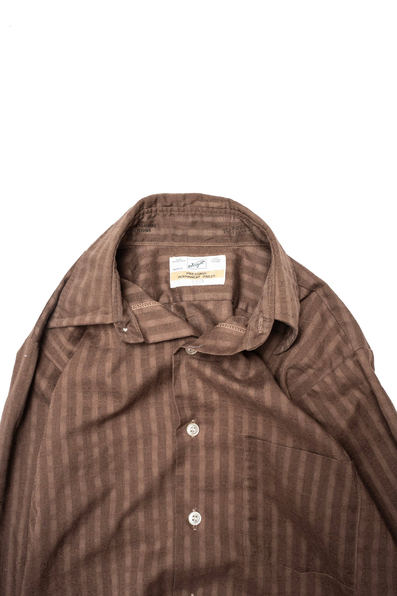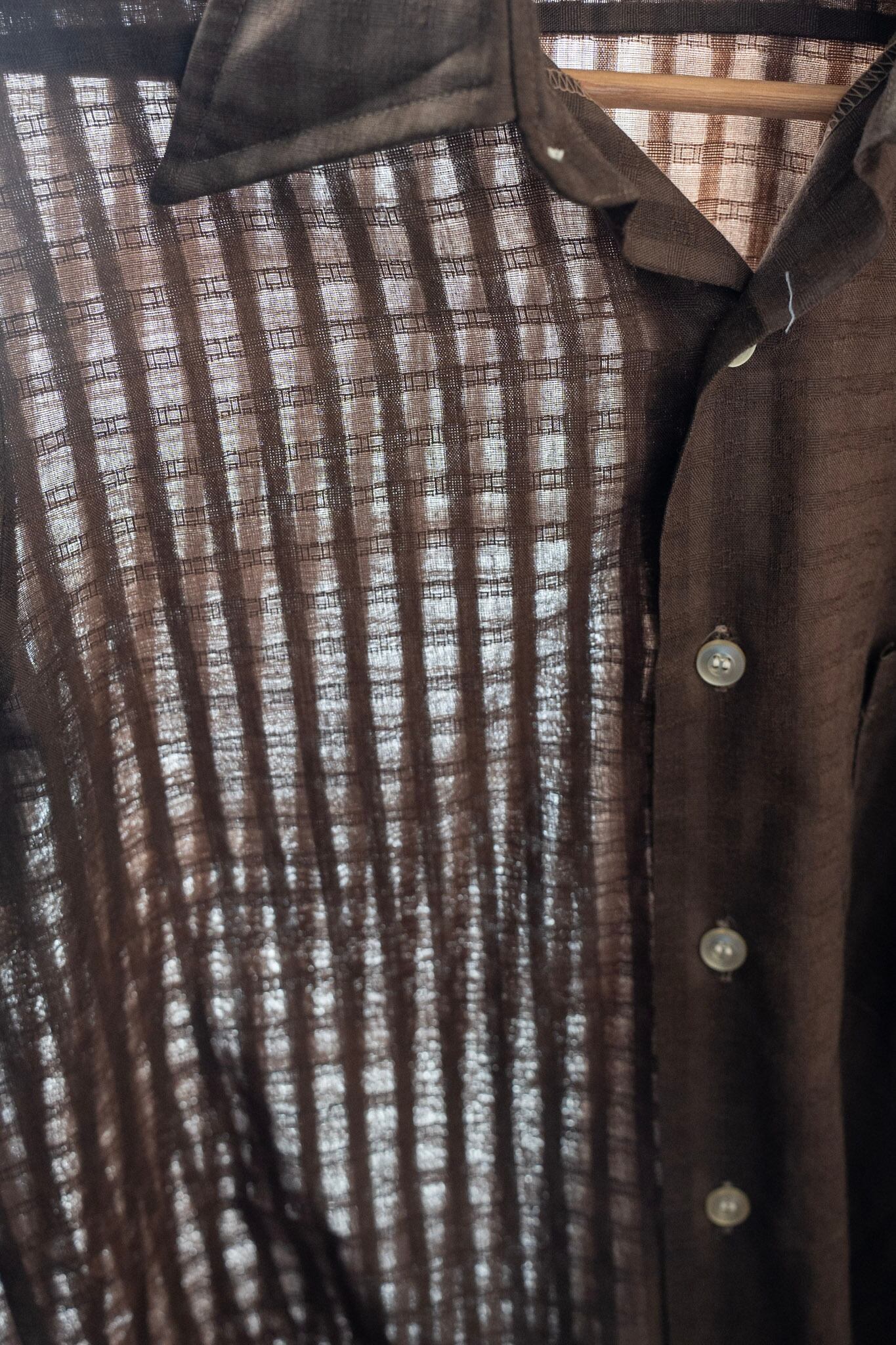 夏初めには日よけ、エアコン需要で非常に人気だった70sの薄手なポリシャツ、今回は秋らしいカラーの一着です。