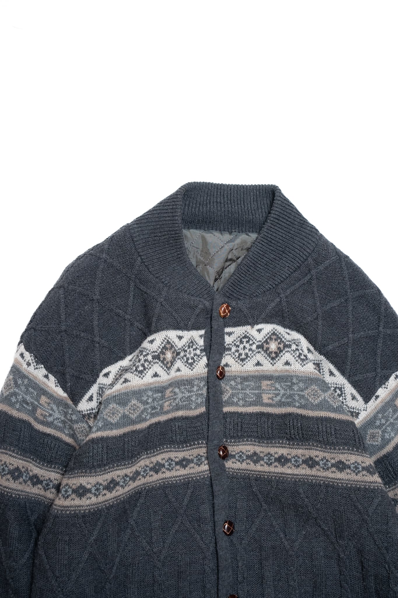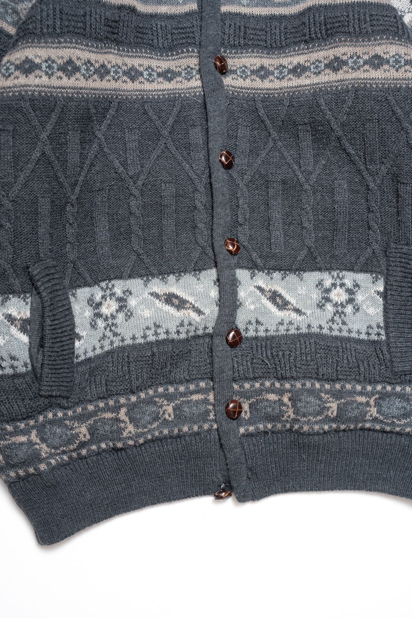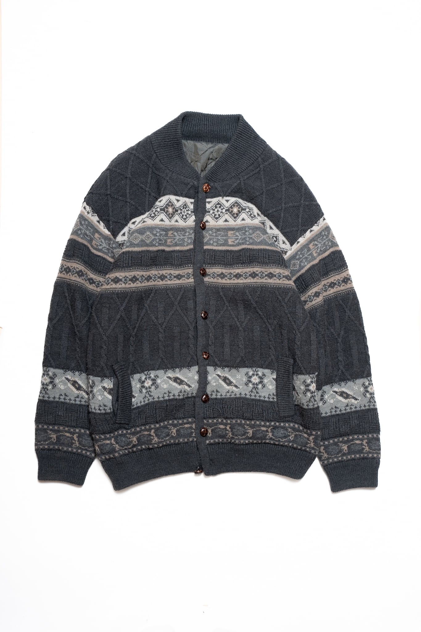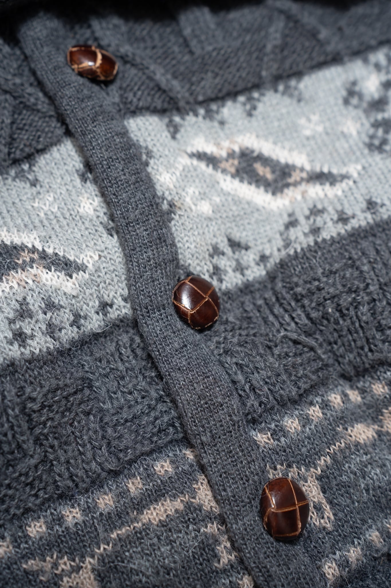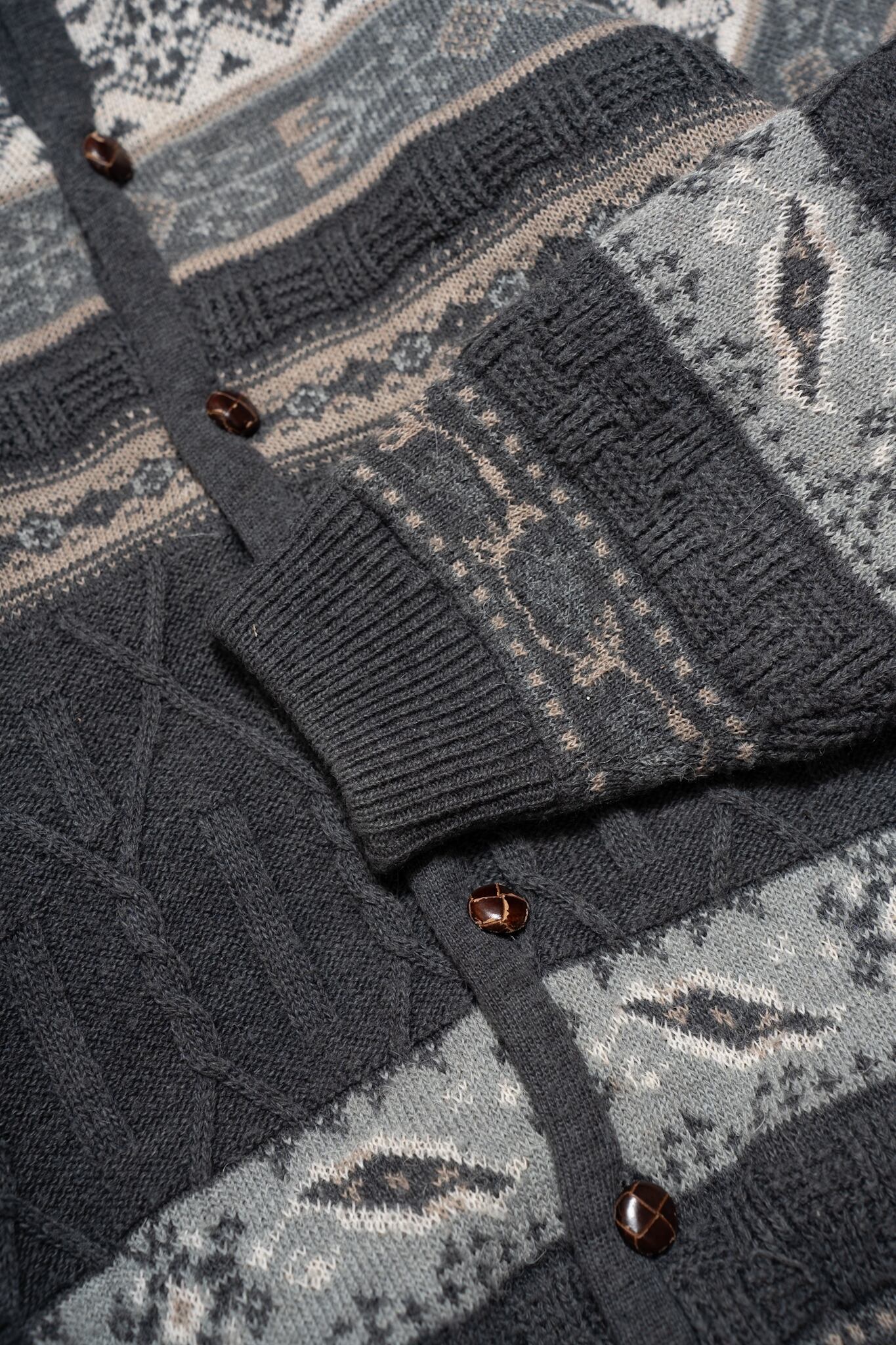 落ち着いたグレー地に胡桃ボタンが上品な、ウールカーディガンをご用意しました。