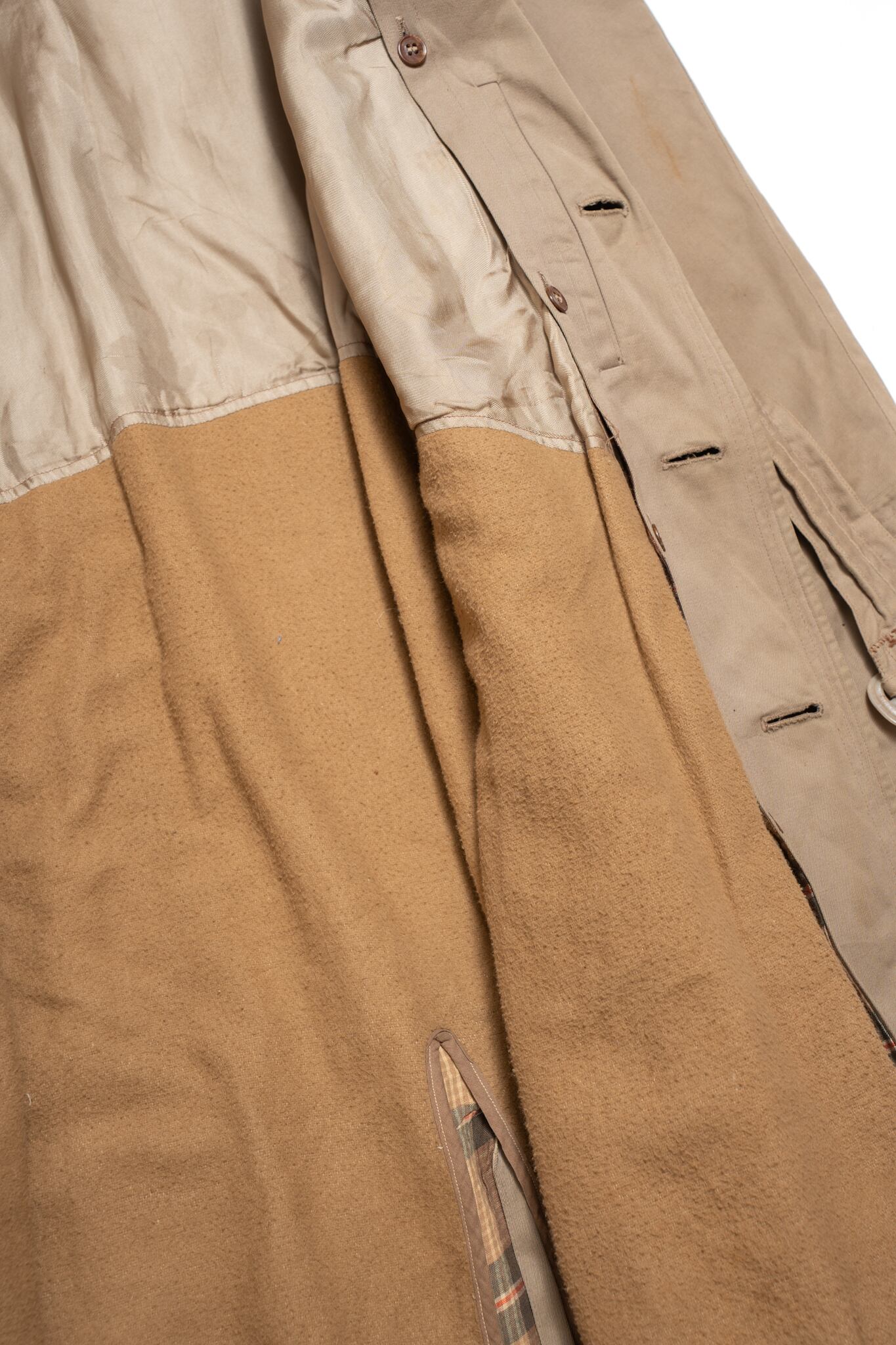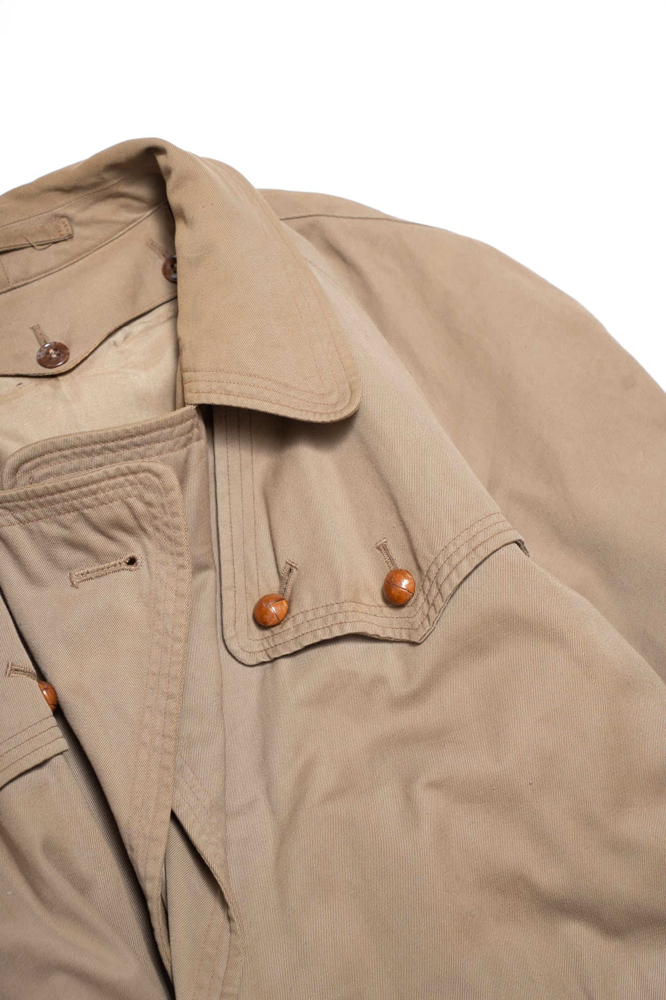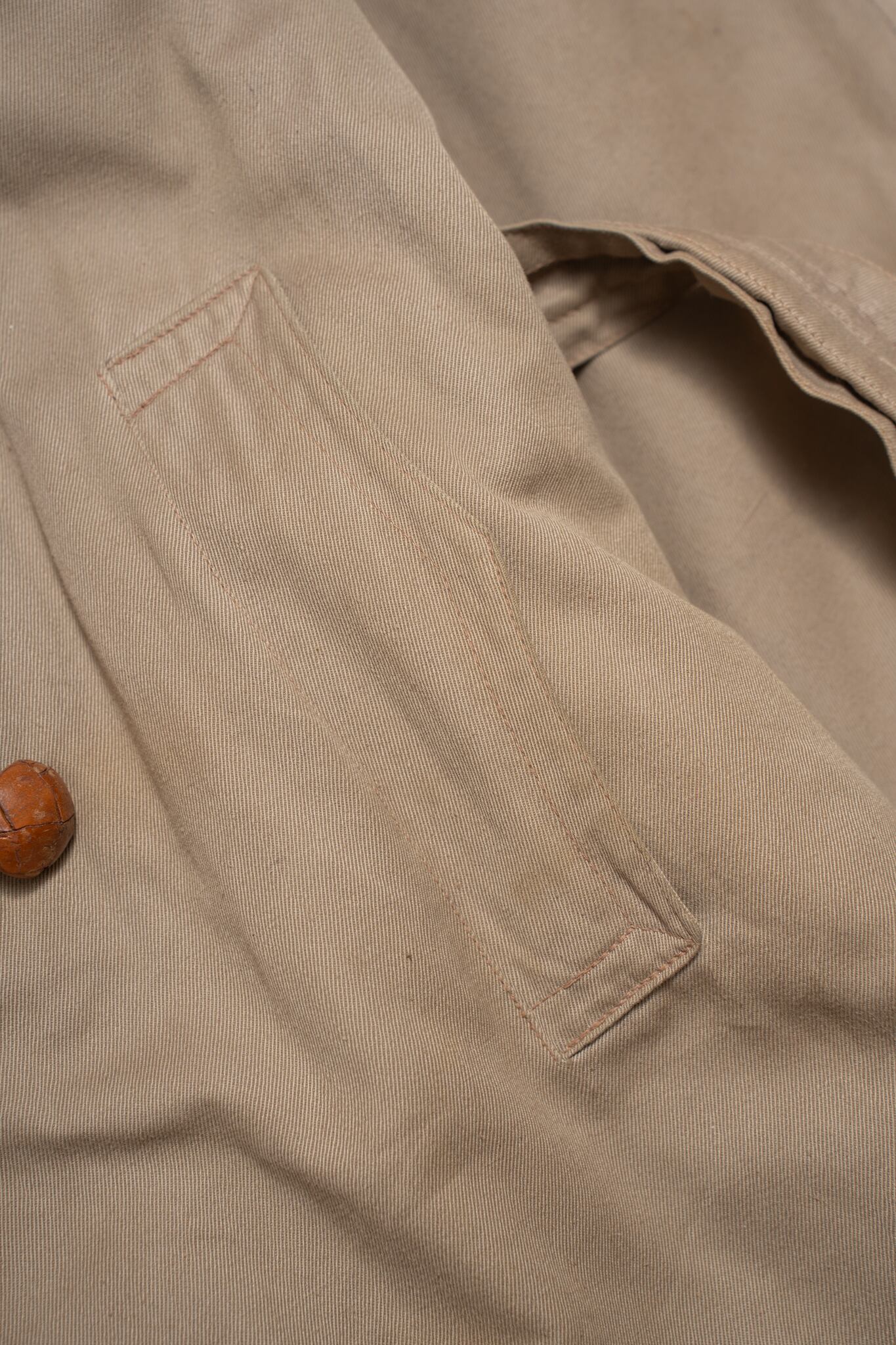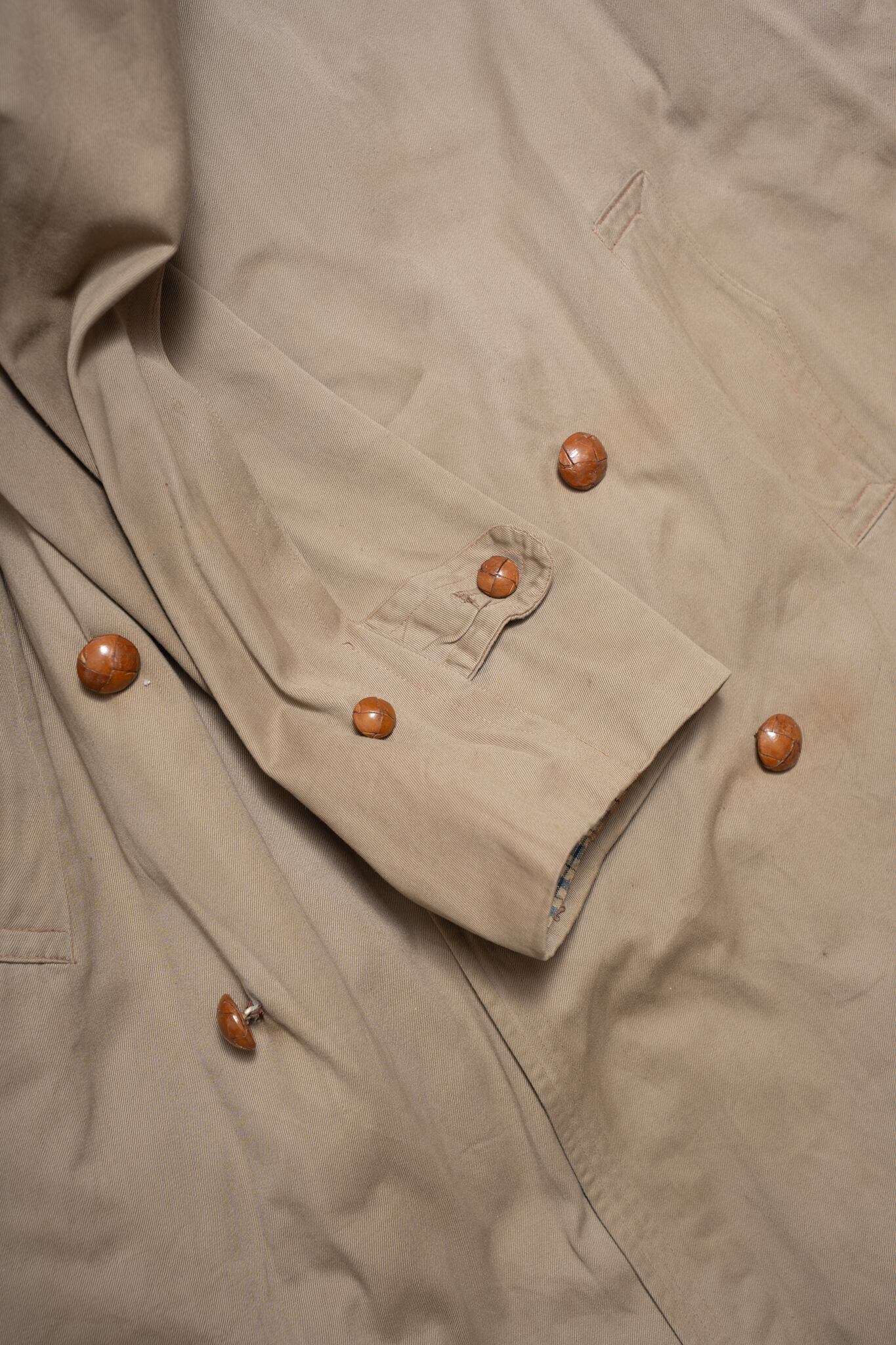 通常のトレンチコートには光沢感の強いコットンギャバが用いられますが、こちらは光沢感が非常に薄く、素朴なツイルのようなテクスチャが最大の魅力かなと思います。