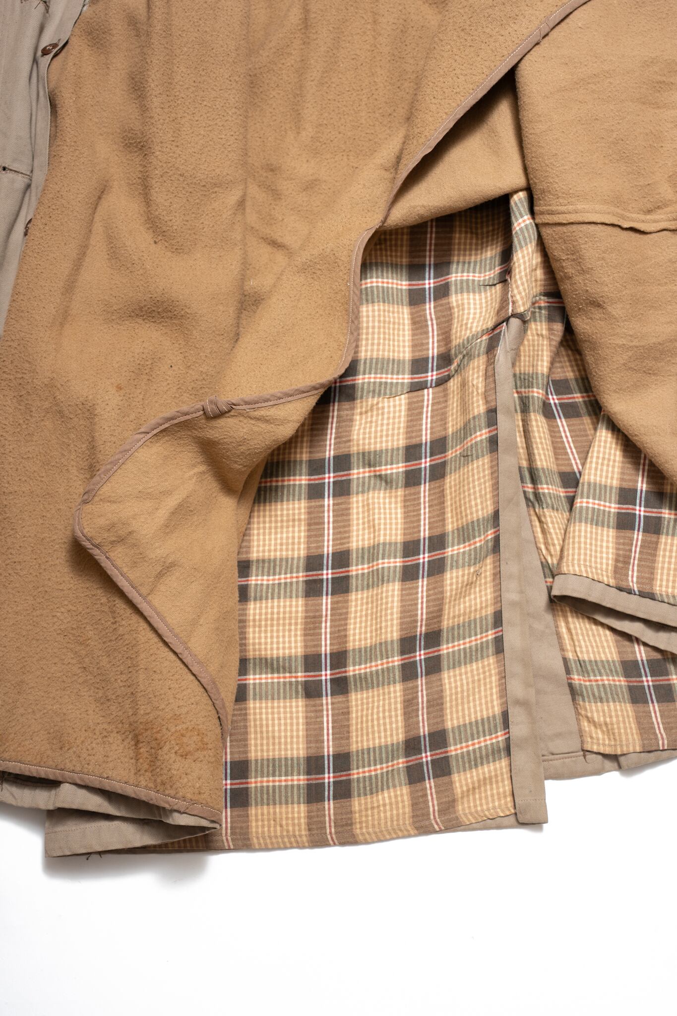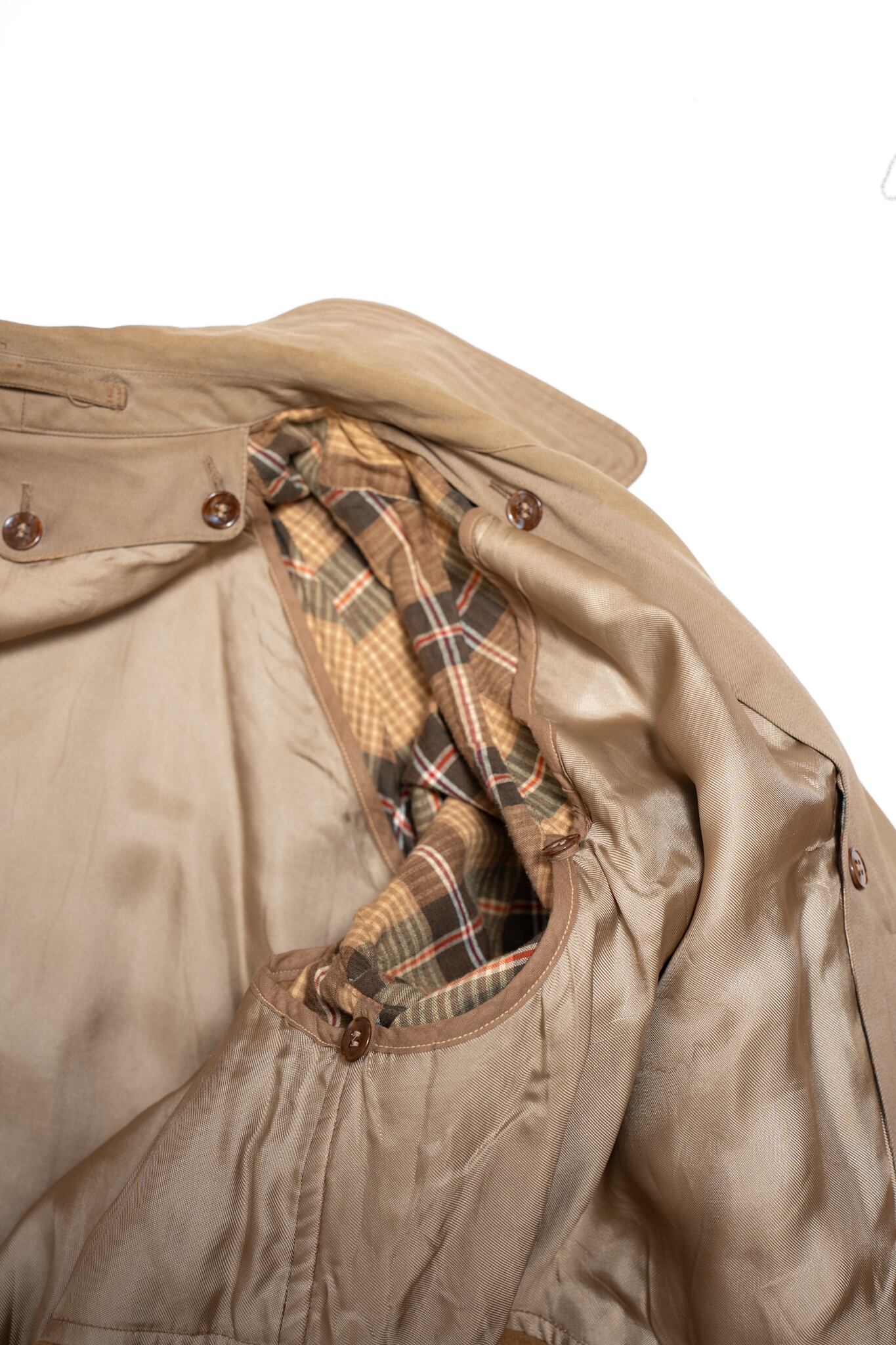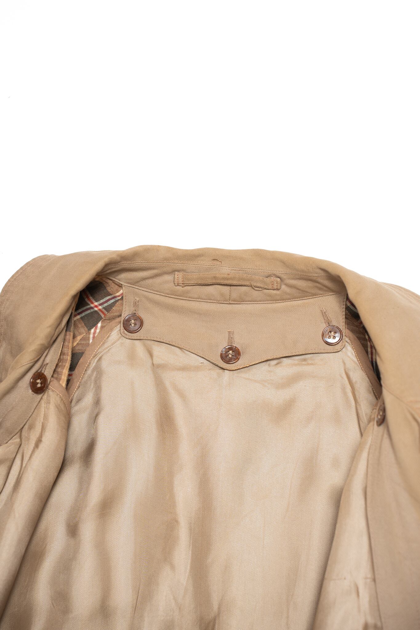 裏地のチェック、トレンチに珍しい胡桃ボタン、穴あきの無いライナーと、春からの主役コートとして申し分ない一着なのは間違いありません。