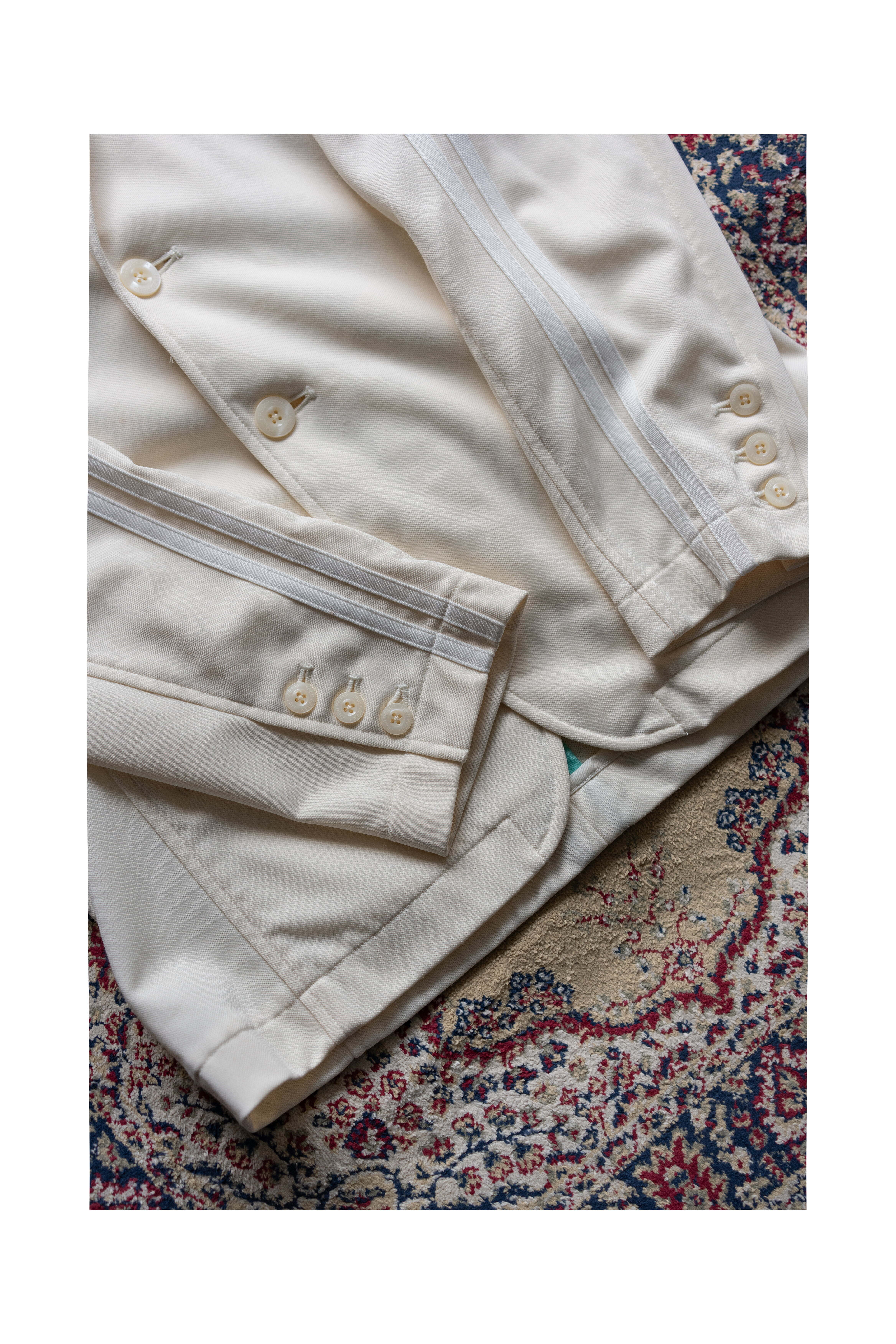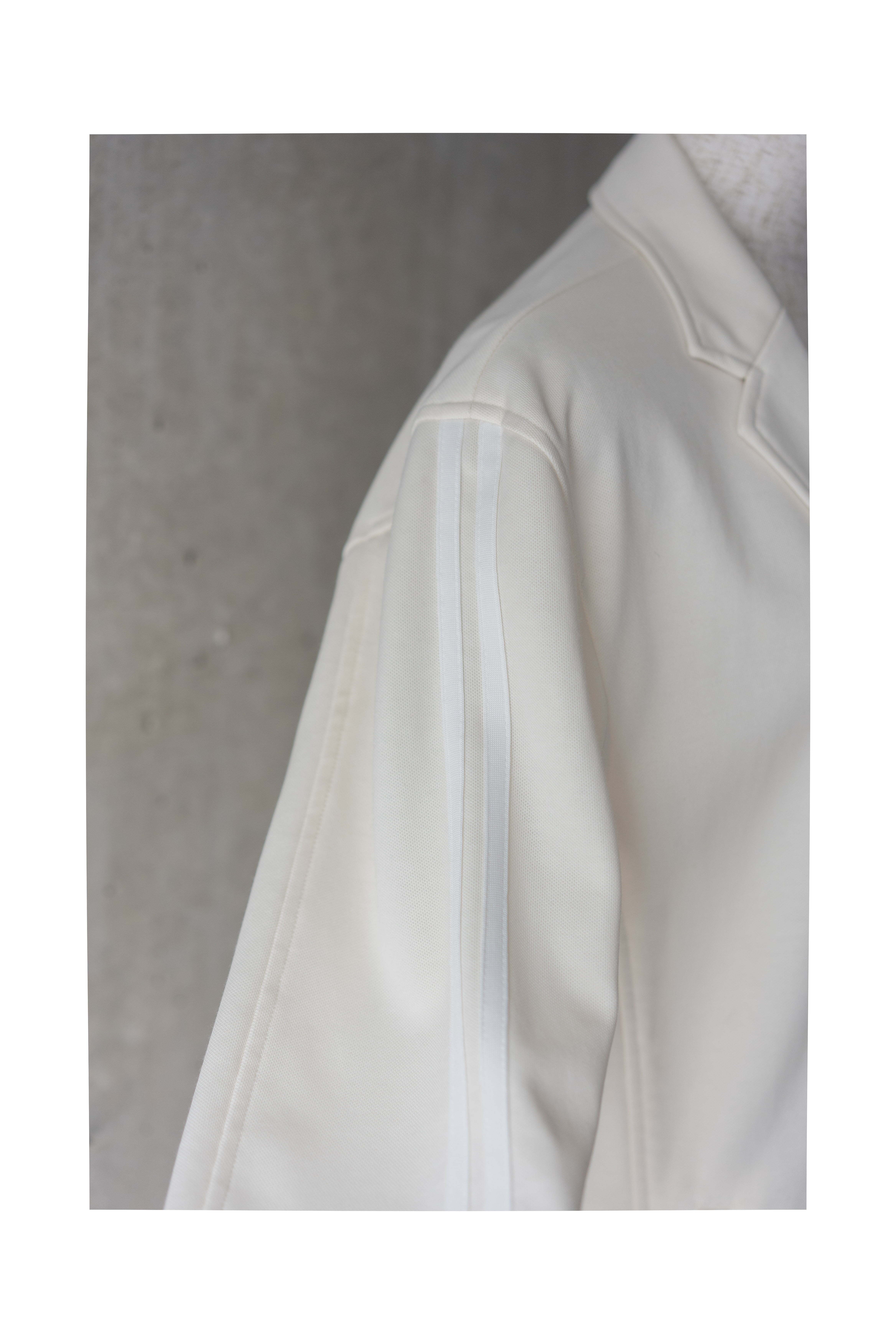 腕に袖と同系色で入った二本線がスポーティーでありながらもどこか上品さを醸し出します。背面の二本線も同様。着用すると完全に見えなくなりますが、飾る楽しさもあるアイテムだと思います。ぜひこの春の本気アイテムに。