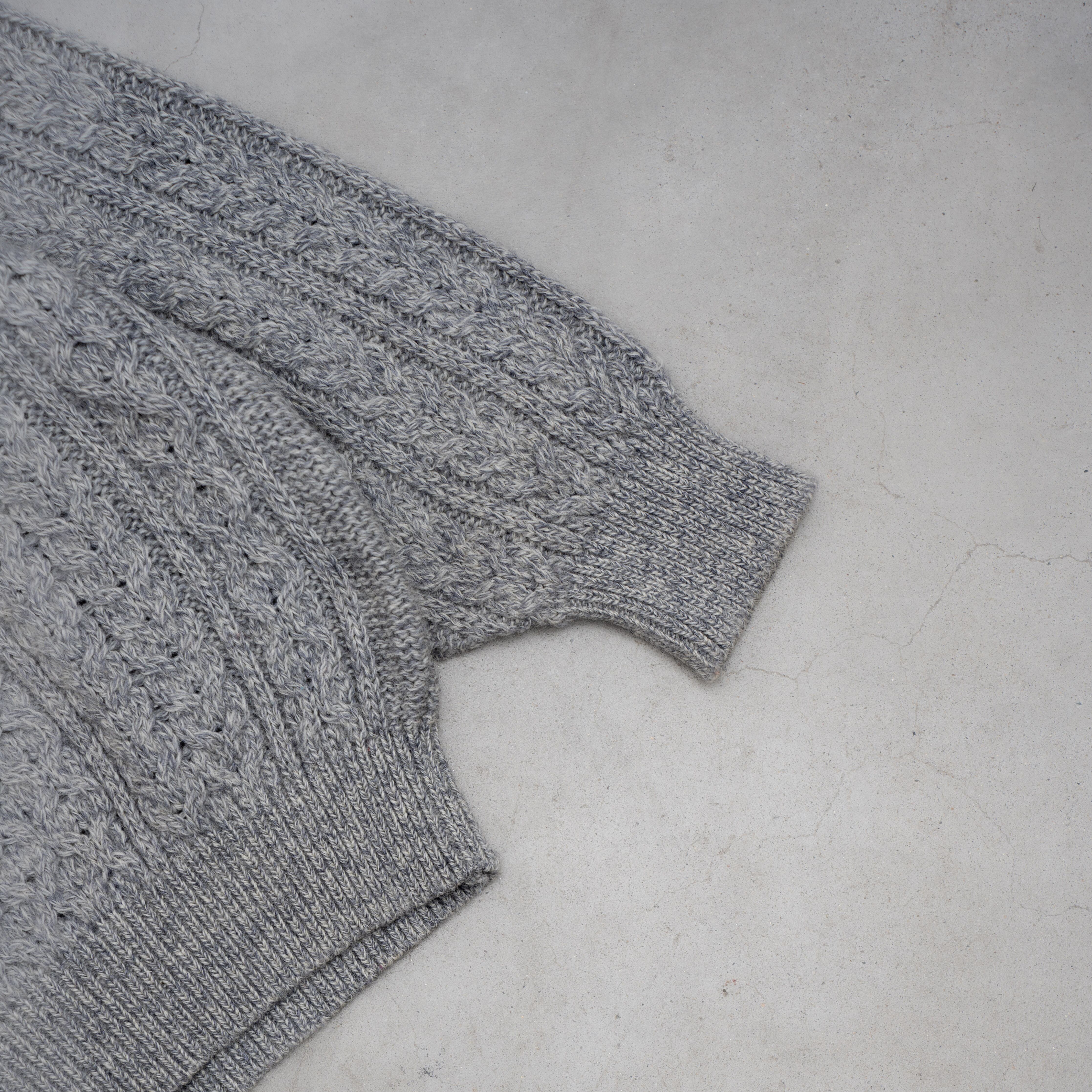 特徴的な編みが特徴な特徴なこちらは、ノルウェーやスコットランドなどの漁師が防寒着として着用してきたフィッシャーマンニットと呼ばれる一着です。アランニットと呼ばれることもあります。